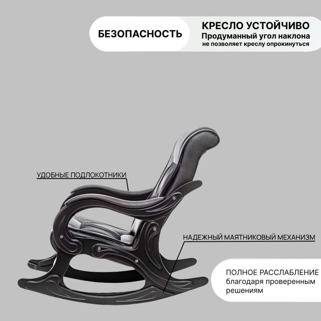 Боковины и подлокотники классического дизайна также изготовлены из дерева на высокотехнологичном оборудовании. Кресло-качалка снабжено удобной подножкой. Особый комфорт и удобство создают эргономичная форма сиденья и спинки, угол наклона и оптимальная амплитуда качания. Экокожа, использованная в обивке, мягкие подголовник и подлокотники подарят уют и покой. Высококачественные материалы дают возможность без труда ухаживать за креслом. Данная модель принесет в интерьер любого помещения чувство основательности, спокойствия и умиротворения. Такое кресло очень долго будет радовать своим комфортом Вас, Ваших родственников и друзей.