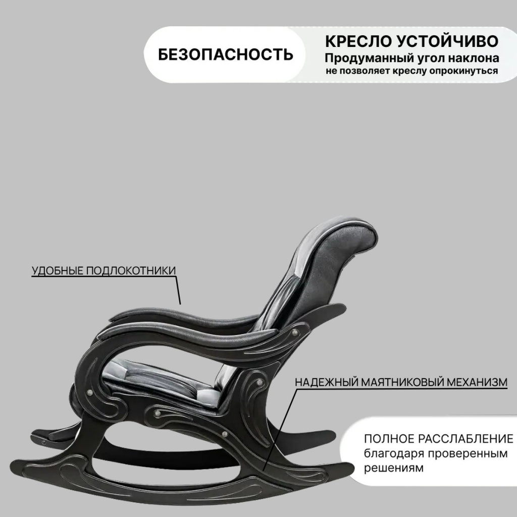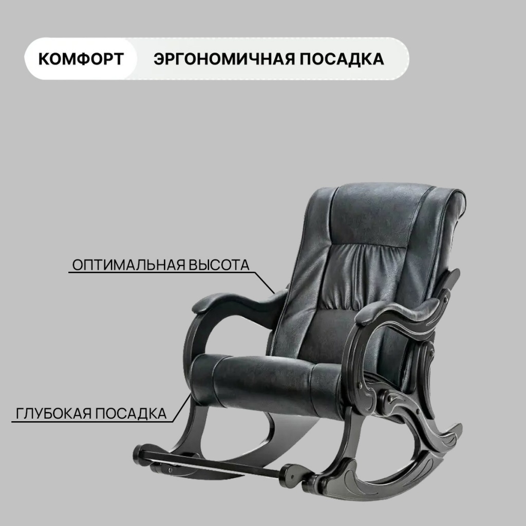 Боковины и подлокотники классического дизайна также изготовлены из дерева на высокотехнологичном оборудовании. Кресло-качалка снабжено удобной подножкой. Особый комфорт и удобство создают эргономичная форма сиденья и спинки, угол наклона и оптимальная амплитуда качания. Экокожа, использованная в обивке, мягкие подголовник и подлокотники подарят уют и покой. Высококачественные материалы дают возможность без труда ухаживать за креслом. Данная модель принесет в интерьер любого помещения чувство основательности, спокойствия и умиротворения. Такое кресло очень долго будет радовать своим комфортом Вас, Ваших родственников и друзей.