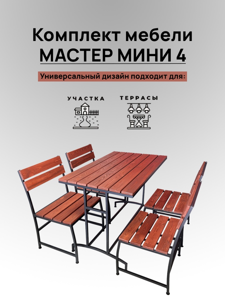 Компактный, кованый комплект Мастер-мини станет прекрасным дополнением экстерьера или интерьера различных архитектурных стилей, будет идеально удобен как на садовом участке, так и в уличных кафе и ресторанах.