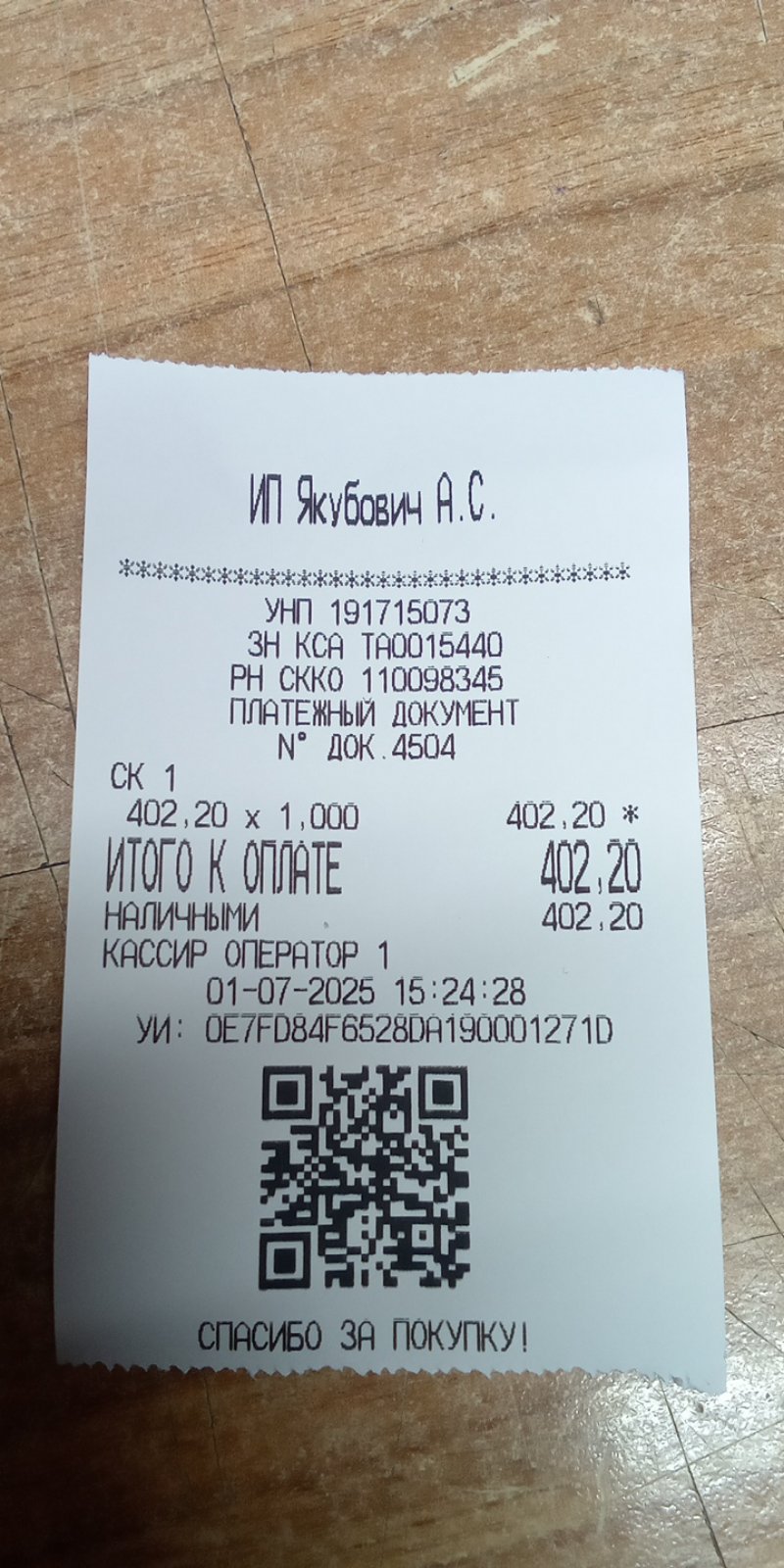 100% предоплата на расчетный счет нашей компании. Любой товар в нашем интернет-магазине можно купить по безналичному расчету (возможность отписать товар с НДС уточняйте у оператора). Данные для выставления счета просьба отправлять через сервис обратной связи в меню КонтактыОбразец чека